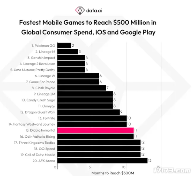 而且在赚钱上,《暗黑破坏神:不朽》确实有一套。根据权威机构data.ai的统计,《暗黑破坏神:不朽》以11个月赚5亿美金(约合36亿人民币元)的成绩,名列全球手游吸金榜第15位,是动视暴雪史上商业化成绩最为耀眼的移动端作品。《暗黑破坏神:不朽》确实有一套。