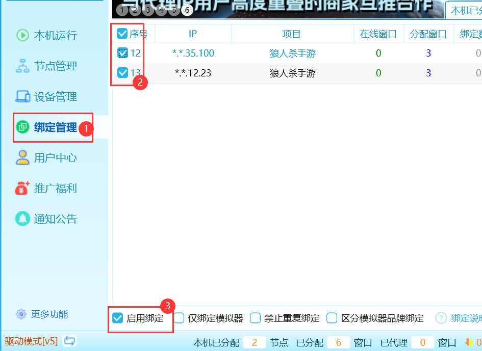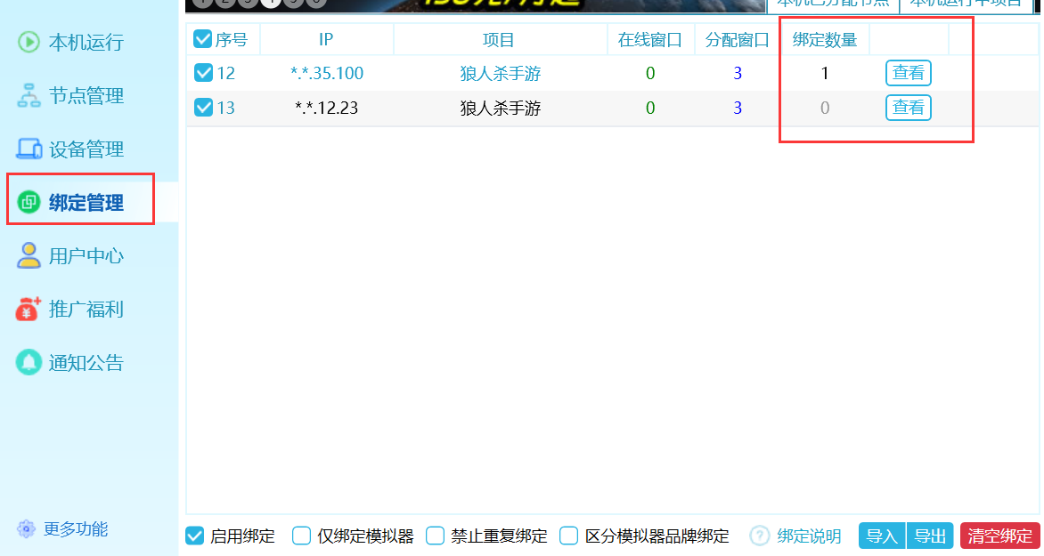 在绑定管理中,节点栏 绑定数量中会显示当前已经绑定了几个模拟器序号,点击查看,可以查看详情