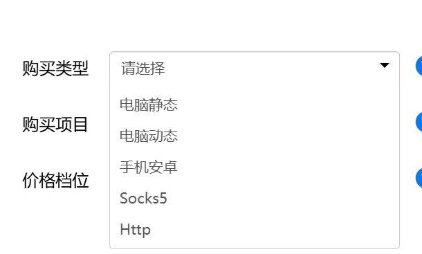 选择 购买项目:请按照需要选择正确的项目,否则无法正常代理。