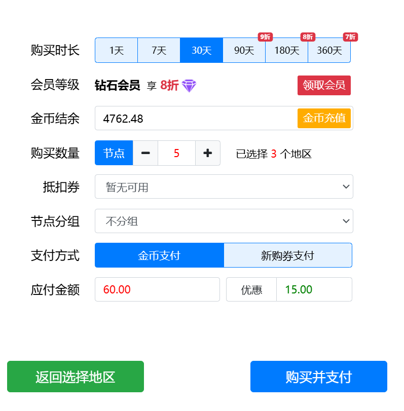 购买时长:默认30天,可以自己选择其他时长,购买时长越大越划算,90天、180天、360天还有时长折扣。