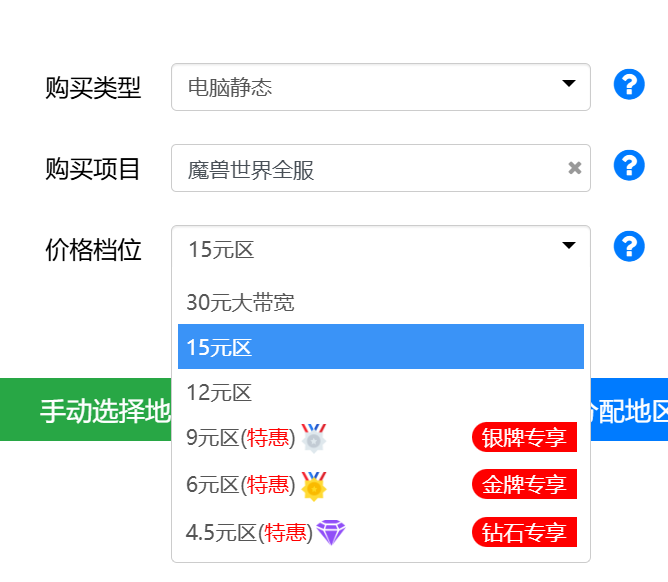 自动分配地区(点击前往):输入 地区数量,IP数量,会自动分配合适的地区及数量。