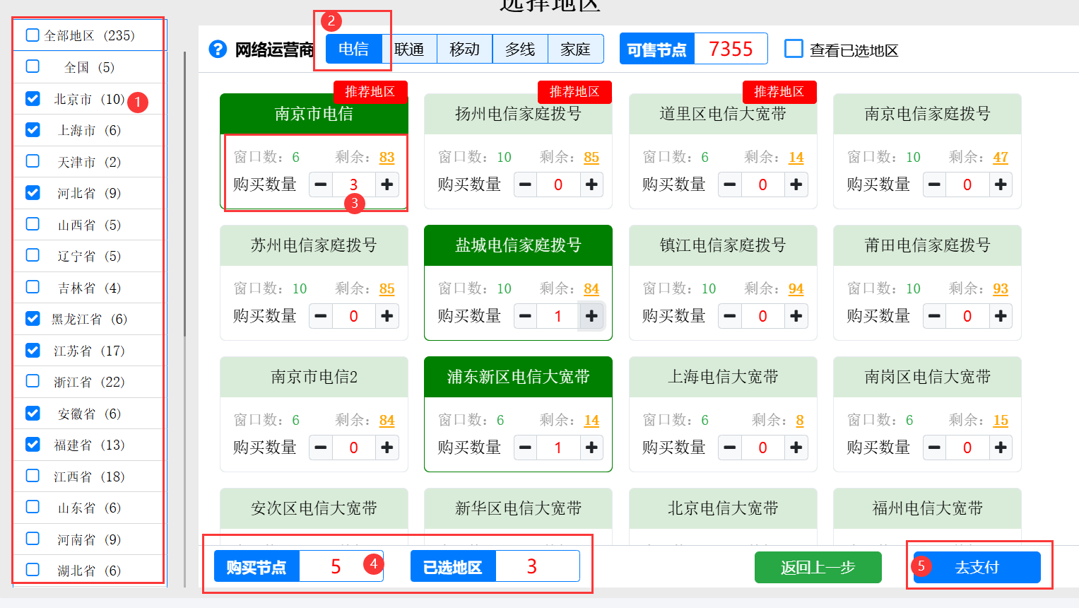 例如:需要购买5条,要同一个地区的,就选择 节点5,地区1;如果需要5条不同地区,就选择 节点5,地区5.