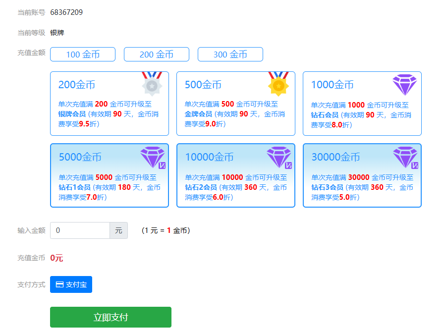 比如:第一次充了 200,接着又充了300,这样只会赠送银牌会员。虽然充了500,但是不是一次性冲的,如果是一次性充值500就会自动赠送一个金牌会员