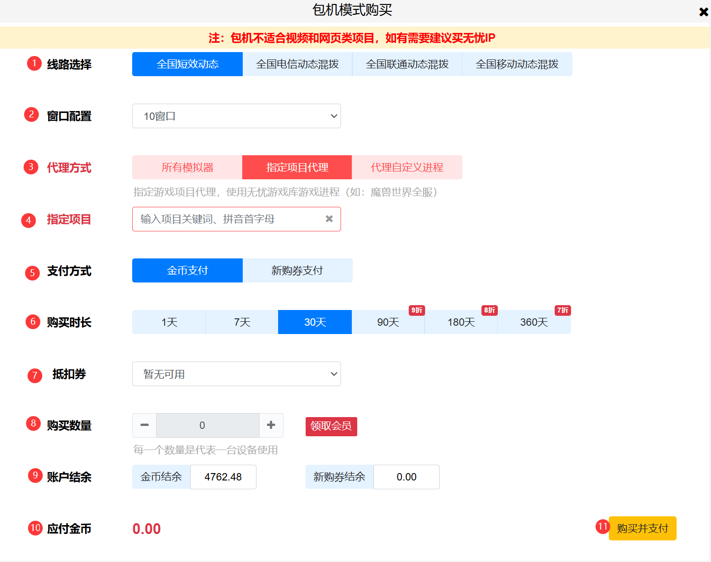 6、购买时长,默认30天,可以自己选择其他时长,购买时长越大越划算,90天、180天、360天还有时长折扣。
