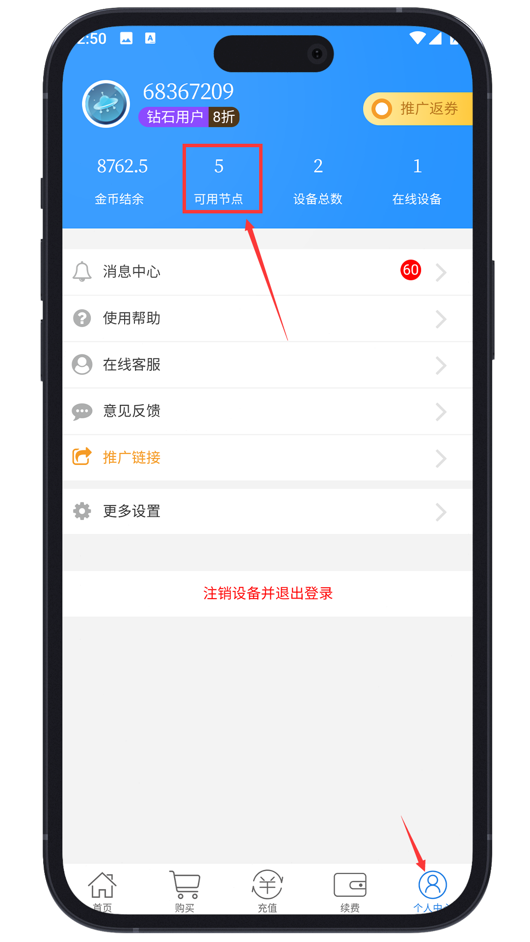 如需使用账号下其他节点,点击个人中心,点击可用节点