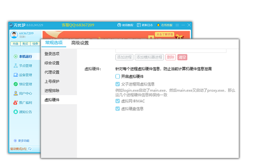 独家研发驱动级虚拟硬件,可虚拟MAC网卡、硬盘、CPU、主板等序列号,多开防封。