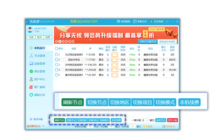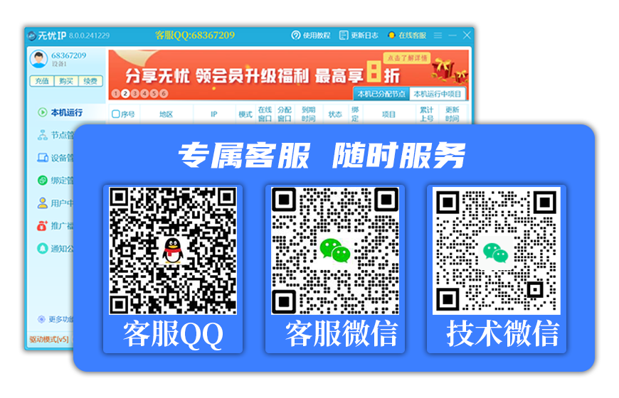 无忧加速器的升级版本,全新驱动内核单节点单窗口地区动态、全国动态智能自动切换,节点热切换单节点多窗口静态,支持一键切换,支持国内250+个地区。价格便宜实惠,有会员折扣、时长折扣,所有折扣可叠加,IP低至3.8元/条/月。